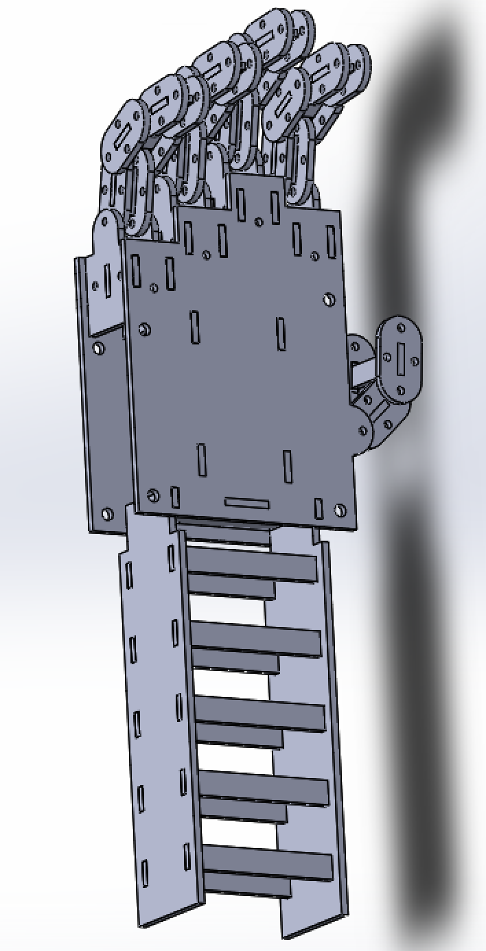 RPS is a very basic game. There are three moves: no fingers (rock), two fingers (scissors), four fingers (paper). Given this fact, the hand was configured to be driven by two motors. The underactuated design greatly simplified the control aspect of the robot. Pairing together the pointer, middle fingers and the ring, pinky fingers was as easy as tying the tendons (strings) together. The thumb stood idle.