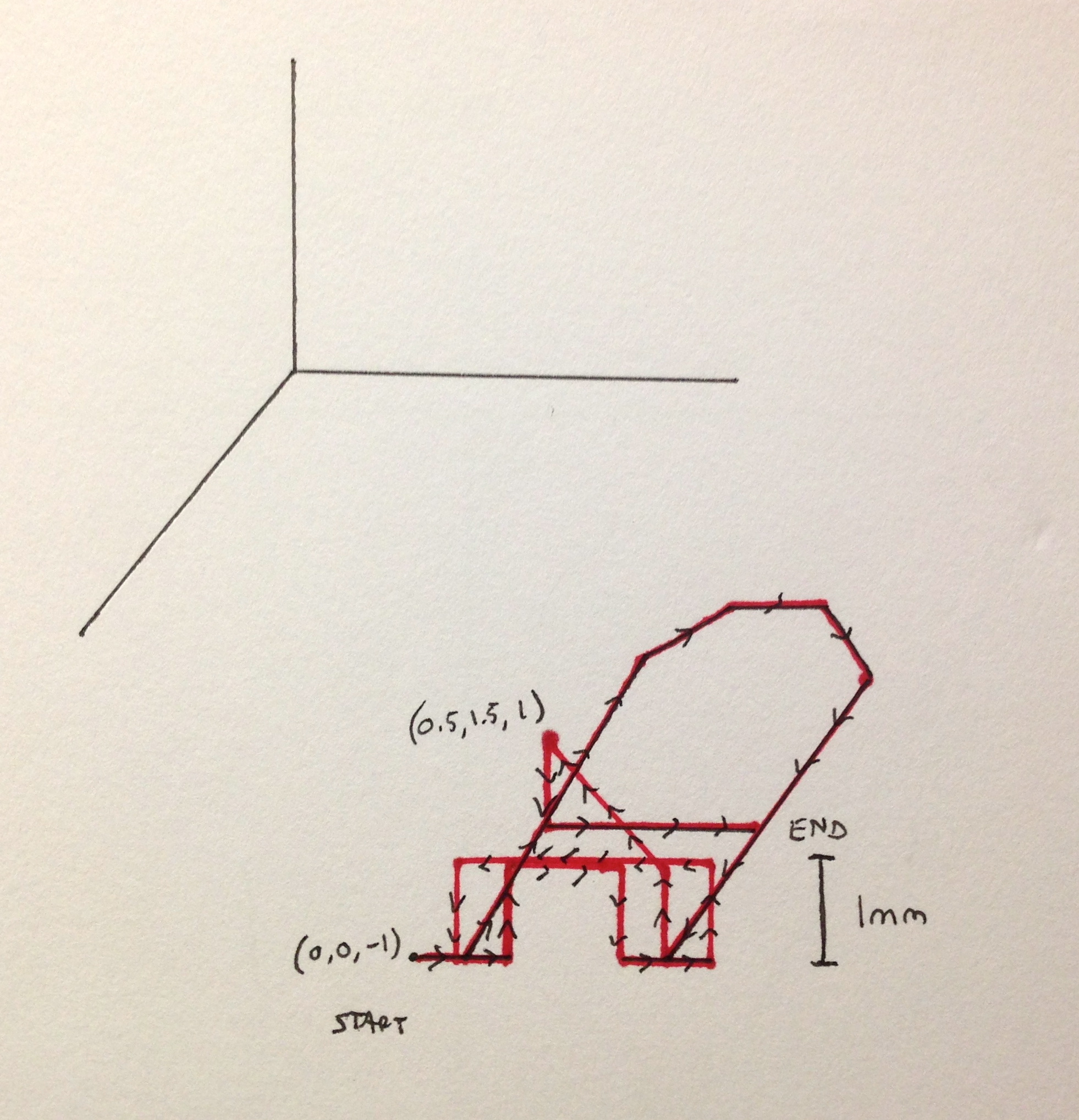 It’s no walk in the park to code, though. It would require mentally picturing each letter as a single connected path in 3-space, defining and entering in the points one by one. Along with taking forever and being an overall headache, it has a huge potential for error, and there would be real way of checking my work, short of writing out the letter with the machine and seeing what happens.