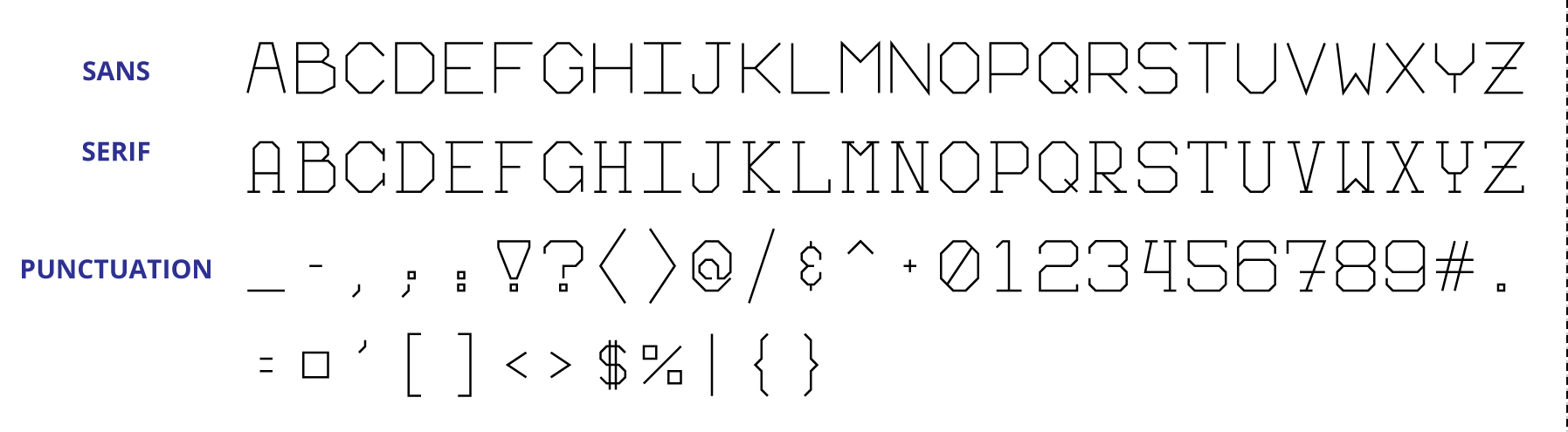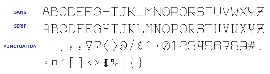 Blender’s fast, responsive, and intuitive user interface made plotting each letter’s line segments a breeze. Once I got the system set up and running, each character took roughly 45 seconds—that’s for the whole process: opening the base file, drawing the letter, saving, and running the .OBJ export script. Before I knew it, I was through the full Serif alphabet, and even had the will left to define another (multiple fonts were not part of the original plan).
