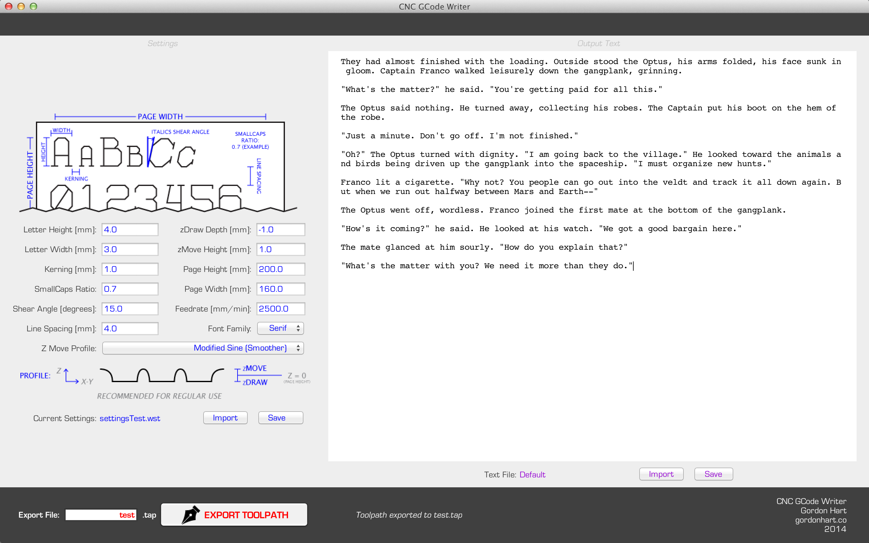 It has a text field for every different input setting, a dropdown menu for the font and the Z Path Profile (more on this in a coming post), and buttons to import and save settings/text files and export the toolpath. The text editor box scrolls as necessary and only accepts ASCII plain text, which suits this application well.