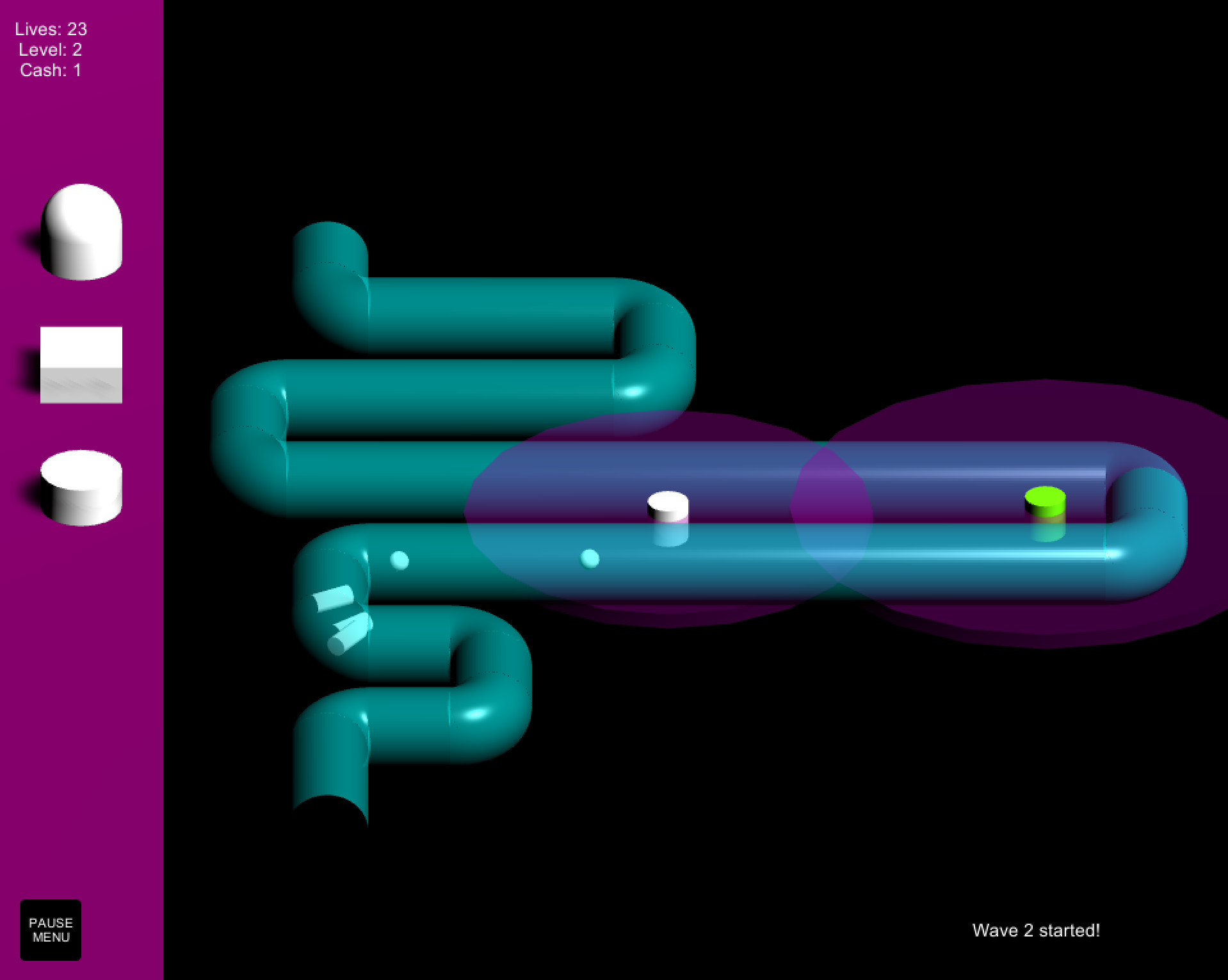 The pieces of the pipe that the critters pass through were modeled in Blender. The original plan was to model all of the towers and critters in Blender as well, but due to time constraints that plan was cut short, and the default Unity objects were used instead.